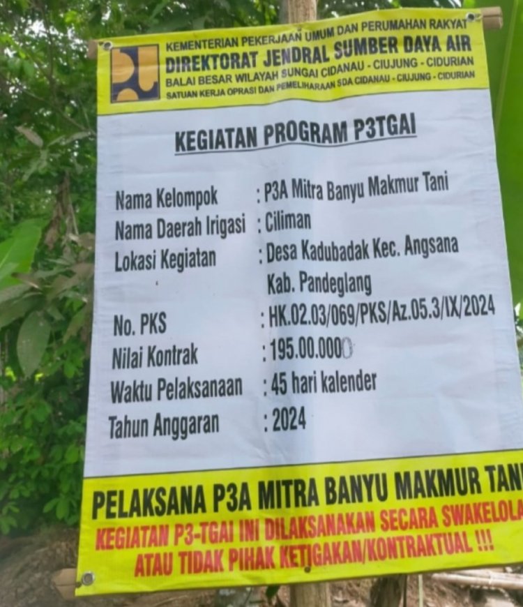independenupdate.com Pandeglang, Banten | Pemerintah Kabupaten Pandeglang Provinsi Banten sedang gencar-gencarnya melakukan pembangunan insfratruktur dari berbagai bidang aspek yang sumber dananya dari APBD tapi parahnya kelompok P3A Mitra Banyu Makmur Tani Desa Kadubadak Kecamatan Angsana Kabupaten Pandeglang provinsi Banten, Yang saat ini sedang Melakukan pekerjaan pembangunan P3-TGAI Drainase Irigasi dengan titik lokasi Didesa Kadubadak, dengan nilai Anggaran Rp. 195.000.000,- (Seratus Sembilan Puluh Lima Juta Rupiah), No.PKS.HK.02.03/069/PKS/Az.05.3/IX/2024. Diduga tak sesuai spek atau asal jadi.