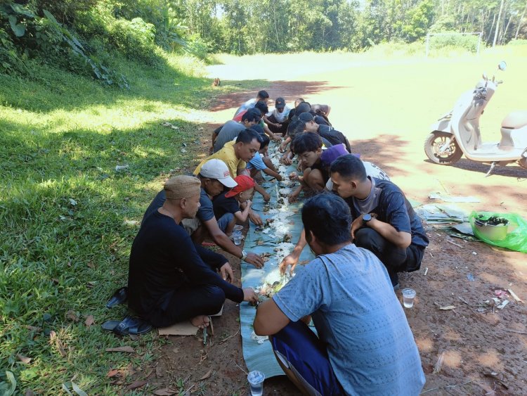 Suasana keakraban semakin terasa ketika seluruh peserta gotong royong melanjutkan kegiatan dengan acara bancakan—makan bersama secara lesehan dengan menu ikan lele bakar yang disajikan di atas daun pisang. Tawa dan canda mengiringi kebersamaan, memperkuat ikatan sosial antarwarga yang sudah terbina selama ini.