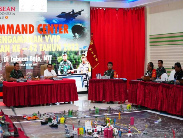 Labuan Bajo, NTT | Kepala Staf Kepresidenan (KSP) Jenderal TNI (Purn) Moeldoko kepada Panglima TNI Laksamana TNI Yudo Margono, S.E., M.M., saat meninjau Posko Kogabpadpam VVIP KTT ASEAN SUMMIT Ke-42 bertempat di Hotel Sylvia Labuan Bajo Nusa Tenggara Timur, Rabu (10/5/2023). Melihat venuenya dari seputaran pinggir pantai, hampir ancamannya muncul dari laut.