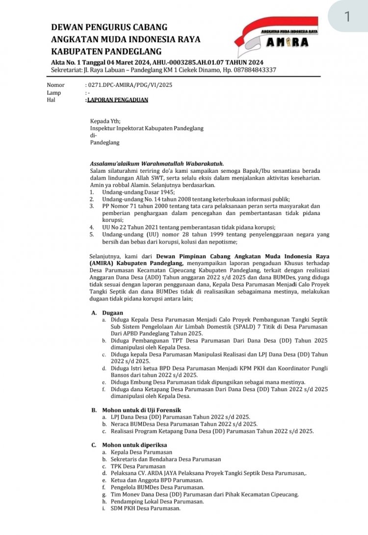 Lanjut Rohikmat yang akrab di sapa Iik Sengkleh "Kami sudah Kumpulkan data bukti fisik yang diduga banyak sekali yang di Mark Up anggaran, dan LPJ Dana Desa (DD) kami menduga dimanipulasi oleh Kepala Desa, Sekdes, Bendahara Desa dan BPD Parumasan, Insya Allah Pada Kamis, 29 Juli 2025, kami akan lakukan Aksi Unras DPMPD, Inspektorat dan Setda Pandeglang terkait tindak Lanjut Laporan Pengaduan yang kami sudah layangkan ke Inspektorat dan DPMPD karena ini jelas masuk dalam delik KKN" Tutupnya. (Mars/Red)